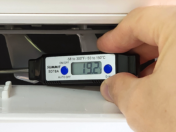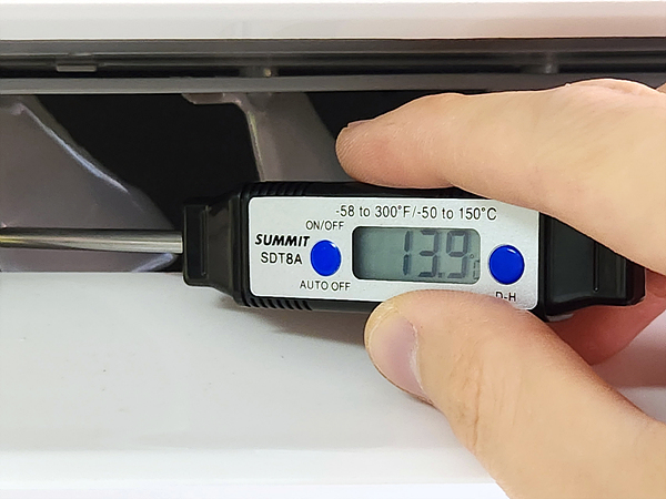 2. 온도계를 사용하여 토출구 온도를 확인하는데요. 바람이 시원하지 않은 경우 에어컨 실외기의 얇은 배관인 고압 배관을 확인합니다. 성에가 하얗게 생긴 경우에는 99% 냉매 부족입니다.