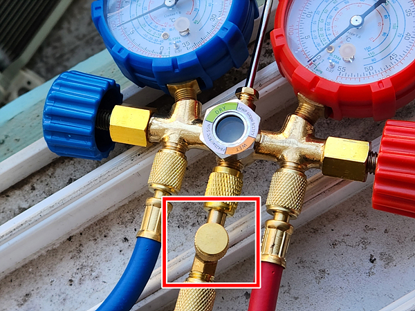 - 배기 밸브를 눌러 잔여 냉매를 빼줍니다.