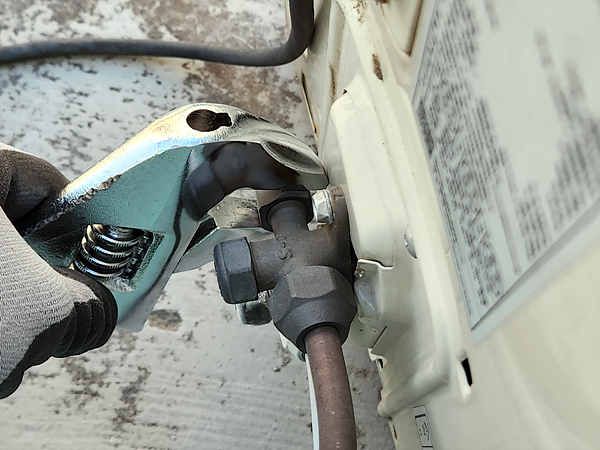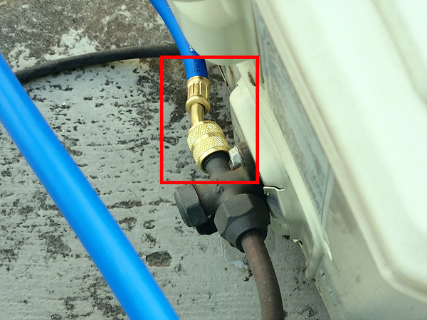 4. 파란색 꺾인 호스 부분을 실외기 저압배관(굵은 배관) 서비스 밸브 너트를 몽키 스패너를 사용해 풀어준 후 연결합니다. 끝까지 조였을 때 냉매가스가 새지 않을 정도로만 꽉 조여주시면 됩니다. 손가락 힘으로 충분합니다.