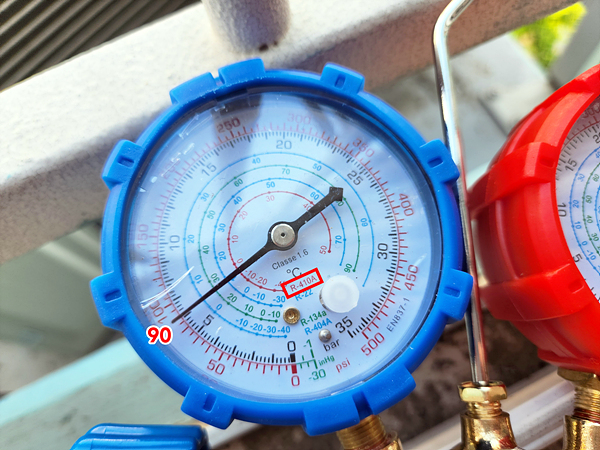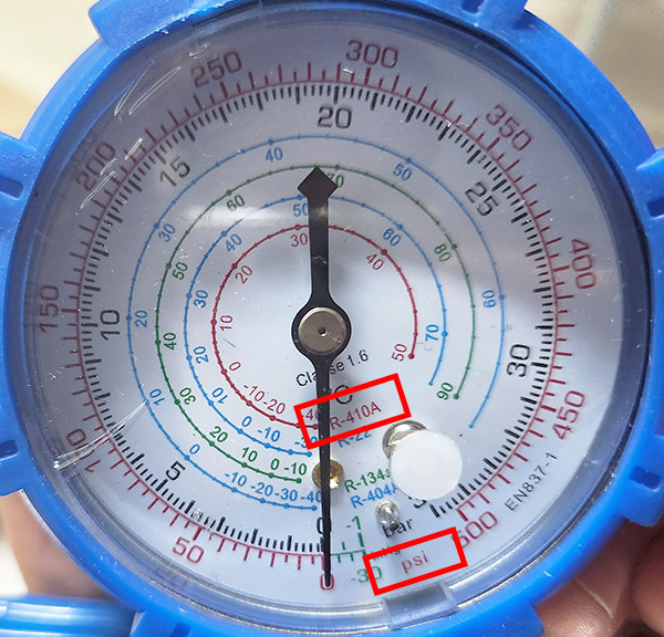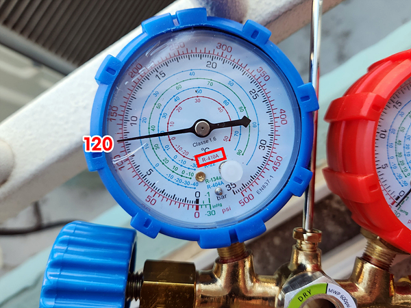 R-410A라고 표기된 게이지에서 0 ~ 5℃ 사이의 압력을 정상 범위로 보는데요. PSI 기준으로는 110 ~ 130 psi입니다.